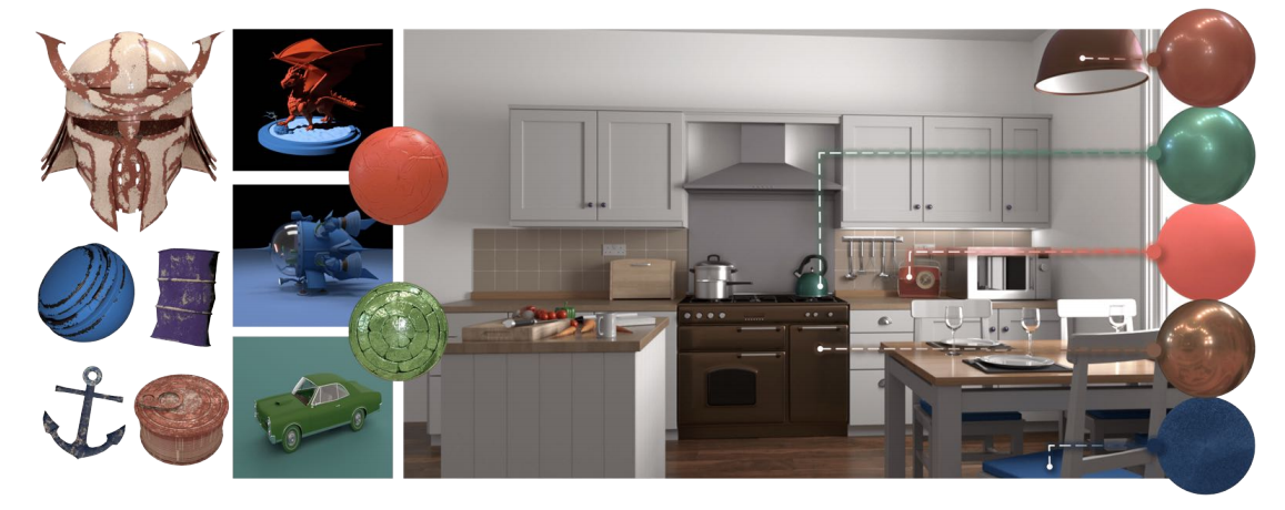 Chenliang Zhou, Zheyuan Hu, Alejandro Sztrajman, Yancheng Cai, Yaru Liu, Cengiz Oztireli Proceedings of the AAAI Conference on Artificial Intelligence, 2025 [Paper] This framework enables neural material synthesis utilizing hyperdiffusion to learn the distribution over material weights. It provides flexible generation guided by multi-modal inputs such as material types, text descriptions, or reference images. |